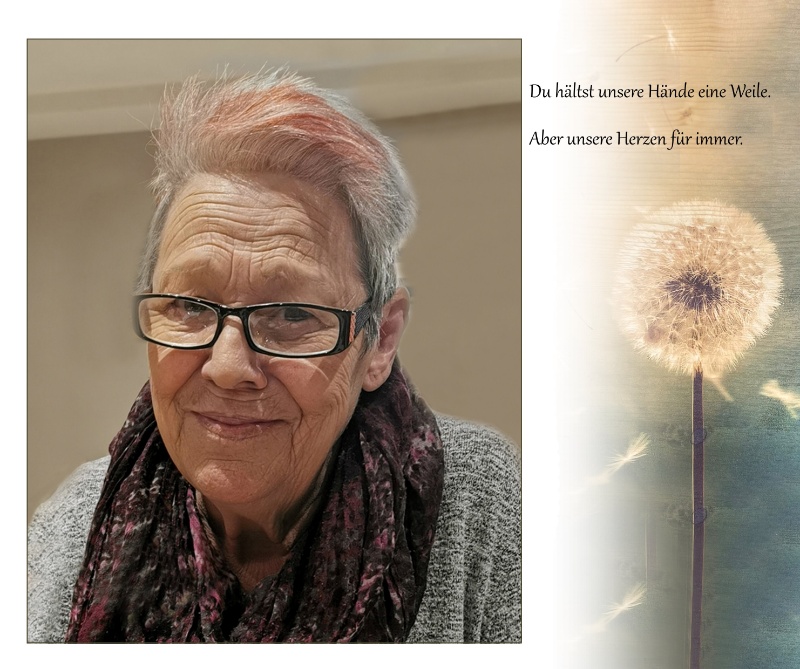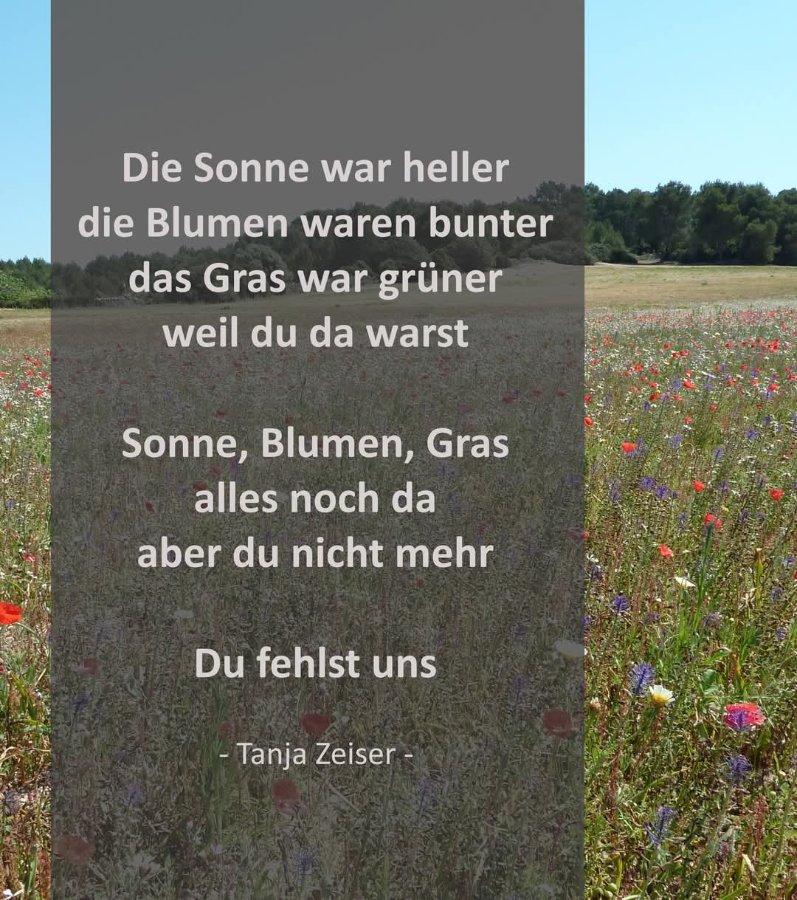 Auch wenn ich dich wieder sehen werde,weil deine Reise auf dieser Erde zu Ende ist,weiss ich, dass alles gemeinsame Erlebteund all die wundervollen Erinnerungen an dichnie verloren gehen werden.Weil ich sie im Herzen trage.